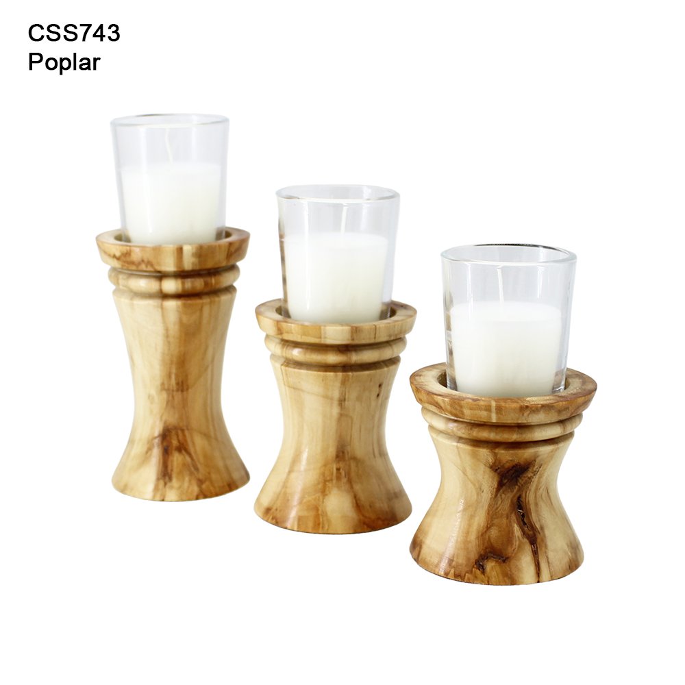 Heights are 2.75″, 3.5″, and 4.5″. Each piece takes one tea light or votive (candles not included).