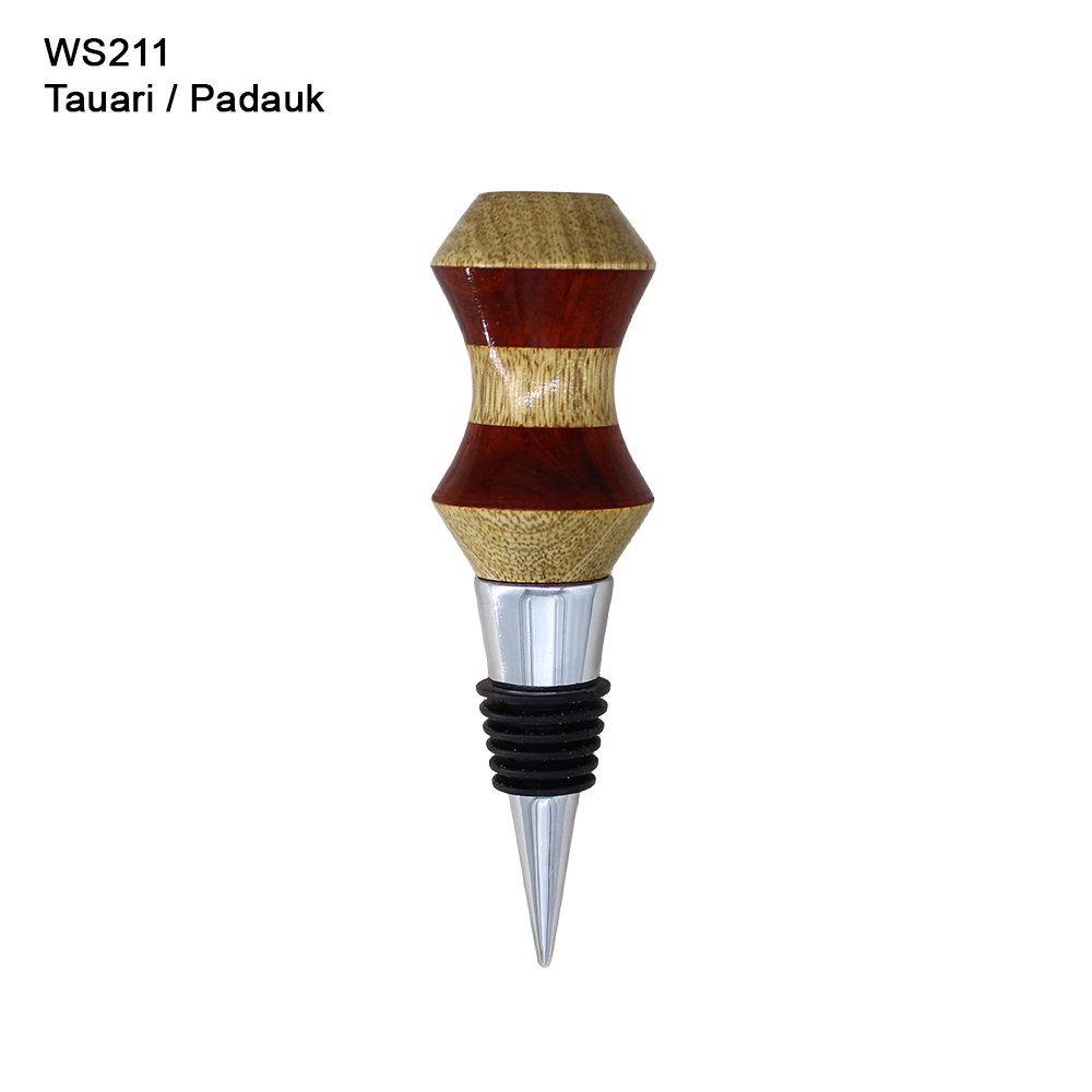 Elevate your wine storage with this exquisite hand-turned bottle stopper crafted from rich Tauari and Padauk. This two-tone stopper is a one-of-a-kind piece, showcasing the natural beauty of the woods with their distinctive grain patterns. Designed for a perfect fit, this functional art not only preserves your favorite wines but also adds a touch of elegance to your barware. Ideal for connoisseurs and gift-givers alike, this stopper is a conversation starter that combines functionality and artistry.